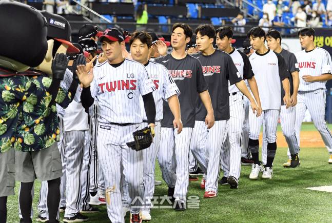 LG 선수들이 16일 잠실구장에서 열린 2022 KBO리그 삼성과의 경기에서 승리한 뒤 하이파이브를 하고 있다. 2022. 8. 16.