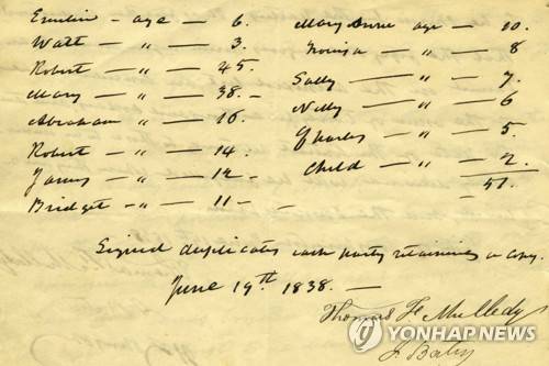FILE - This image made available by the Maryland Province of the Society of Jesus shows a portion of an 1838 document listing 272 enslaved men, women and children who were sold by the Jesuit owners of Georgetown University to plantation owners in Louisiana. On Tuesday, Aug. 16, 2022, Joseph Stewart, a key figure in the racial reconciliation initiative announced by the U.S. Jesuits in 2021 with descendants of people once enslaved by the Catholic order, issued a statement expressing deep dissatisfaction with the lack of progress and inaction. (Archives of the Maryland Province of the Society of Jesus, Box 40, File 10, Item 3a-h, on deposit at the Botth Family Center for Special Collections, Georgetown University Library, Washington, D.C. via AP, File) AP PROVIDES ACCESS TO THIS THIRD PARTY PHOTO SOLELY TO ILLUSTRATE NEWS REPORTING OR COMMENTARY ON FACTS DEPICTED IN IMAGE; MUST BE USED WITHIN 14 DAYS FROM TRANSMISSION; NO ARCHIVING; NO LICENSING; MANDATORY CREDIT