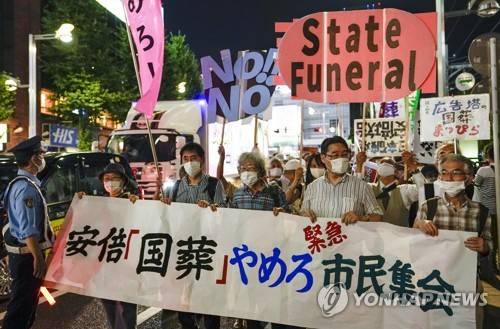 epa10124282 People hold a banner reading 'stop Abe's state funeral' as they protest against the upcoming state funeral for Japan?s former Prime Minister Shinzo Abe, in Tokyo, Japan, 16 August 2022. Opinion polls carried out at the end of July showed over 50 percent of Japanese people oppose the state funeral for the slain politician, while deep relationships between Abe and the Unification Church were reported after the assassination. Abe was shot dead on 08 July during a pre-election campaign act. The state funeral is scheduled for 27 September 2022. EPA/KIMIMASA MAYAMA