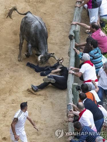 epa10124317 Runners are chased by bulls during the 'El Pilon' running-the-bulls in the village of Falces, Navarra, northern Spain, 16 August 2022. 'El Pilon' running-the-bulls is held on a hill where runners have to avoid the herd of cows on a 800 meter long and narrow slope with the mountain on one side and a steep cliff on the other. EPA/PEIO H
