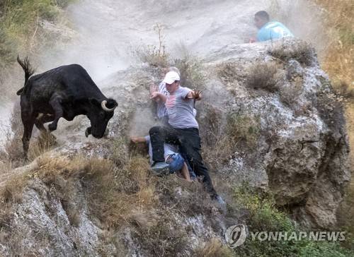 epa10124315 Some runners fall during the 'El Pilon' running-the-bulls in the village of Falces, Navarra, northern Spain, 16 August 2022. 'El Pilon' running-the-bulls is held on a hill where runners have to avoid the herd of cows on a 800 meter long and narrow slope with the mountain on one side and a steep cliff on the other. EPA/PEIO H