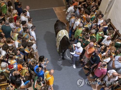 epa10124324 The horse 'Reo Confesso' (C), running for the city's 'Selva' contrada, a district of Siena, is lead from the blessing of the quarter's horse race team with Italian jockey Sebastiano Murtas (unseen) ahead of the historical Italian horse race 'Palio di Siena' in Siena, Italy, 16 August 2022. The traditional horse races between the Siena city districts are usually held on 02 July as the 'Palio di Provenzano' on the holiday of the Madonna of Provenzano and on 16 August as the 'Palio dell'Assunta' on the holiday of the Virgin Mary. It is the first time the Palio horse races are held again after a two years pause because of the pandemic. EPA/CLAUDIO GIOVANNINI