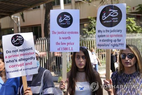 Protesters with frozen bank deposits holds placards outside a court building during a protest calling for the release from detention of Bassam al-Sheikh Hussein, who held hostages in a bank last week, in Beirut, Lebanon, Tuesday, Aug. 16, 2022. Hussein, a food-delivery driver surrendered last Thursday after a seven-hour standoff in return for getting $35,000 of his money and promises that he would only be questioned then set free. (AP Photo/Hussein Malla)