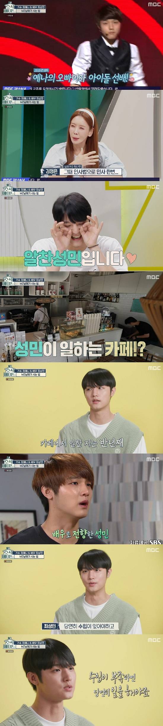 최성민은 "남녀공학으로 2010년도에 데뷔를 했었다"고 답했다. 김정은은 "실례가 안된다면 그때 인사법을 해주실 수 있냐"라고 부탁했고, 최성민은 "안녕하세요 저는 알찬 성민입니다"라며 제스처를 취했다. 최성민은 "그때 당시에 저희 멤버들이 다 이름이 네 글자였다"라고 설명하며 부끄러워했다. 이어 "지금 이제 연기자로 전향해서 열심히 살고 있다"고 전했다.