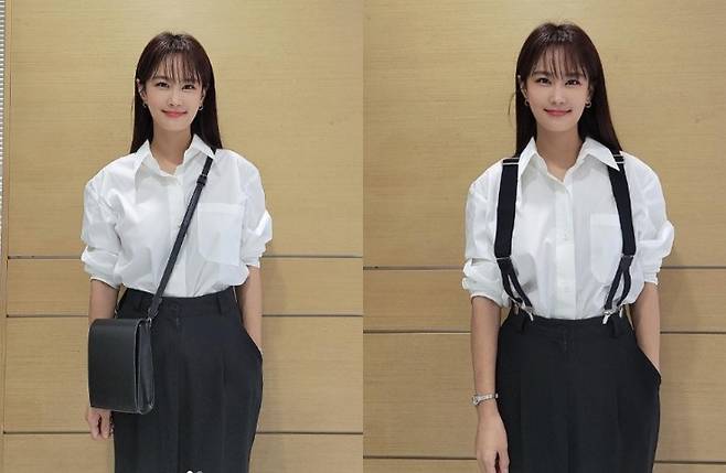 사진에는 김지민이 화이트 셔츠에 블랙 팬츠를 매치하고 포즈를 취하고 있는 모습이 담겨있다.
