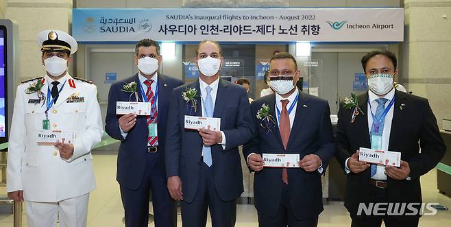 [서울=뉴시스] 공항사진기자단 = 16일 오후 인천국제공항 제1터미널에서 열린 사우디아항공 인천-리야드-제다 노선 취항식에서 사미 알사드한 주한 사우디아라비아 대사(가운데)와 리함 자레이 사우디아항공 아시아지역본부장(왼쪽에서 네 번째)이 참석자들과 항공탑승권 모형 기념품을 들고 기념 촬영하고 있다. 2022.08.16. photo@newsis.com