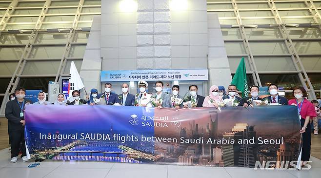 [서울=뉴시스] 공항사진기자단 = 16일 오후 인천국제공항 제1터미널에서 열린 사우디아항공 인천-리야드-제다 노선 취항식에서 사미 알사드한 주한 사우디아라비아 대사(왼쪽 일곱번째)가 참석자들과 기념 촬영하고 있다. 2022.08.16. photo@newsis.com