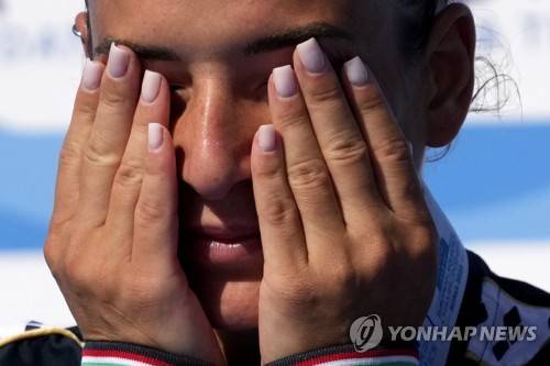 Italy's Elena Bertocchi celebrates after winning the diving women's 1m springboard final at the European swimming championships, in Rome, Tuesday, Aug. 16, 2022. (AP Photo/Gregorio Borgia)