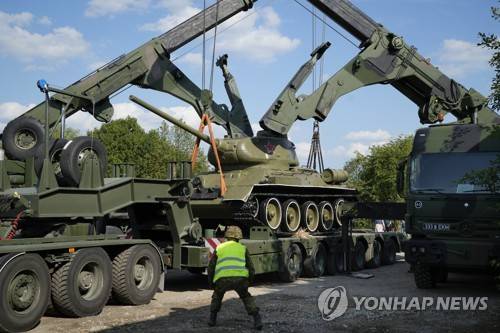Cranes unload a Soviet T-34 tank which was installed as a monument in Narva from a trailer at a military museum in Tallinn, Estonia, Tuesday, Aug. 16, 2022. Estonia's government said Tuesday it has decided to remove a Soviet monument in the border town of Narva, sitting in the Baltic country's Russian-speaking part, with the prime minister saying the reason for the dismantling is that it represents a risk for public order. (AP Photo/Sergei Grits)