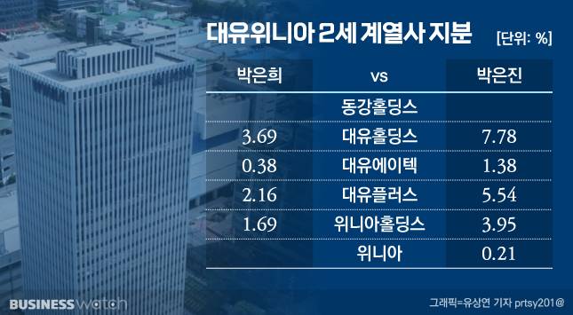 후계구도에 관한 한, 박 회장의 장녀 박은희(33)씨는 사실상 논외의 대상이지만 굳이 불러낸 이유는 바로 서울 강남의 대유타워에 있다. 원래 대유타워는 사실상 대유위니아 계열사 소유였다. 옛 동강레저(58%), 대유에이텍(20%), 동강홀딩스(3%)가 지분 81%를 보유했다.