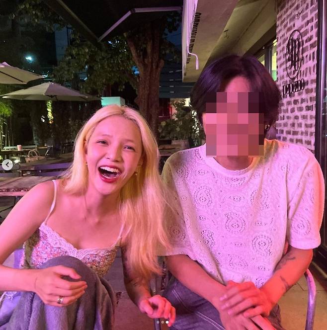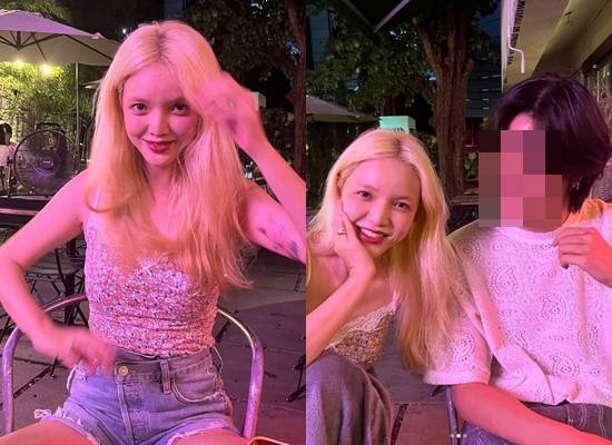 사진 속 카페를 방문한 지민은 훈훈한 외모의 남사친 옆에서 환하게 웃고 있다. 눈썹까지 염색한 노란색 탈색 머리와 짧은 반바지, 어깨를 드러낸 시원한 스타일링이 돋보인다. 특히 남사친 얼굴을 직접 공개하며 다정한 근황을 전해 눈길을 끈다.