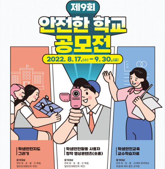 교육부와 학교안전공제중앙회는 학교안전에 대한 사회적 관심을 유도하기 위해 '제9회 안전한 학교 공모전'을 개최한다.