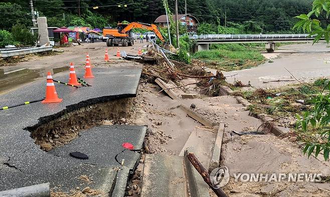 (강릉=연합뉴스) 유형재 기자 = 17일 오전 강원 강릉시 주문진읍 장덕리를 흐르는 하천이 폭우로 한때 범람해 재난 당국이 복구 작업을 벌이고 있다. 2022.8.17