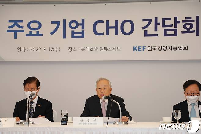 (서울=뉴스1) = 손경식 한국경영자총협회 회장이 17일 서울 중구 롯데호텔에서 열린 주요 기업 인사담당책임자(CHO) 간담회에서 모두 발언하고 있다. (한국경영자총협회 제공) 2022.8.17/뉴스1
