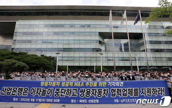 (서울=뉴스1) 박세연 기자 = 쌍용자동차 노조원들이 17일 오전 서울 여의도 산업은행 본점 앞에서 쌍용차의 성공적인 M&A 추진을 위한 기자회견을 하고 있다.