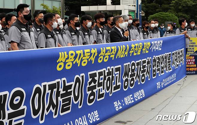 (서울=뉴스1) 박세연 기자 = 쌍용자동차 노조원들이 17일 오전 서울 여의도 산업은행 본점 앞에서 쌍용차의 성공적인 M&A 추진을 위한 기자회견을 하고 있다.