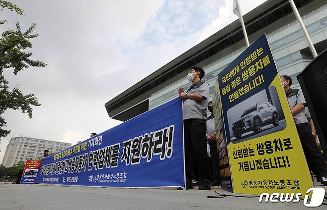 (서울=뉴스1) 박세연 기자 = 쌍용자동차 노조원들이 17일 오전 서울 여의도 산업은행 본점 앞에서 쌍용차의 성공적인 M&A 추진을 위한 기자회견을 하고 있다.