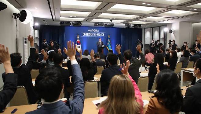 윤석열 대통령이 17일 서울 용산 대통령실 청사에서 열린 취임 100일 기자회견 '대통령에게 듣는다'에서 기자들의 질문에 답하고 있다.