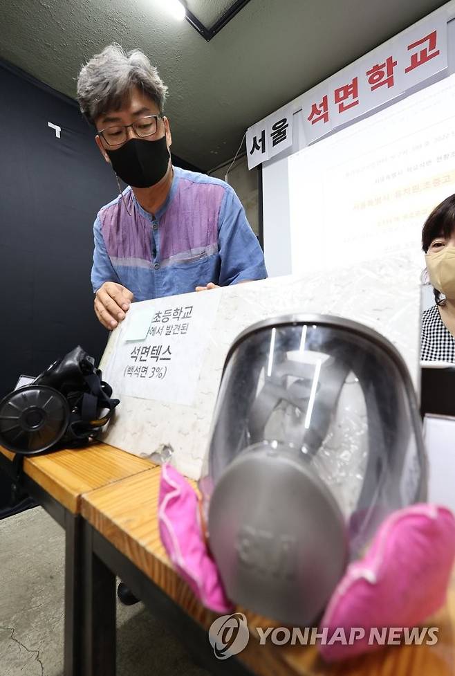(서울=연합뉴스) 임헌정 기자 = 최예용 환경보건시민센터 소장(왼쪽부터), 박숙단 전교조 서울지부 정책실장이 17일 서울 종로구 서울환경운동연합에서 '서울 학교 석면 현황조사 및 정책개선 제안' 기자회견을 하고 있다. 2022.8.17