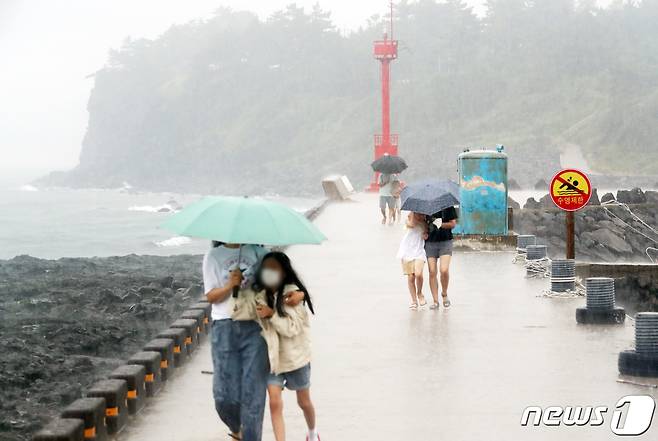 (제주=뉴스1) 오현지 기자 = 제주 전역에 호우 경보가 내려진 17일 오전 제주시 애월읍 해안도로에서 관광객들이 발걸음을 옮기고 있다. 2022.8.17/뉴스1