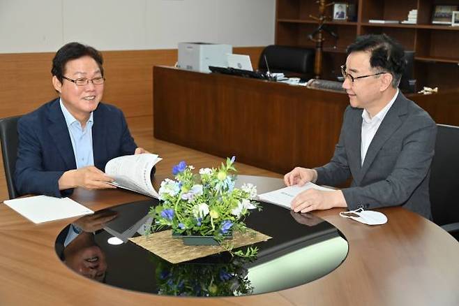 하승철 하동군수가 지난 16일 박완수 경남도지사를 만나 군의 주요 현안을 설명하고 이에 대한 적극적인 지원과 협조를 건의했다.