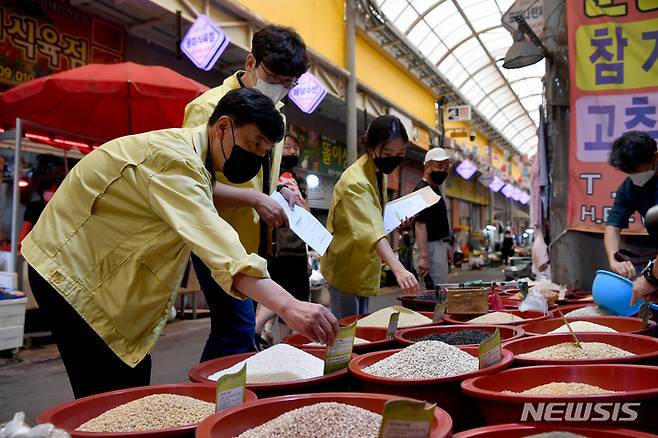 [광주=뉴시스] 이영주 기자 =17일 오전 광주 북구 시장경제과 직원들이 북구 말바우시장에서 원산지 표시 여부 등을 점검하고 있다. 2022.08.17.leeyj2578@newsis.com