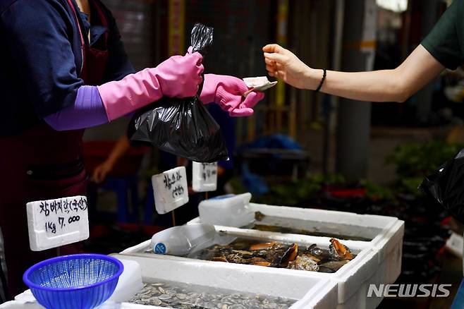 [광주=뉴시스] 이영주 기자 = 추석을 24일 앞둔 17일 오후 광주 북구 말바우시장 한 수산물 상점에서 상인과 손님이 수산물을 거래하고 있다. 2022.08.17. leeyj2578@newsis.com