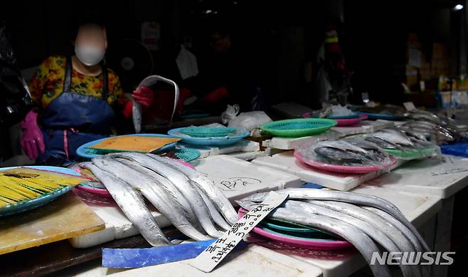 [광주=뉴시스] 이영주 기자 = 추석을 24일 앞둔 17일 오후 광주 북구 말바우시장 한 수산물 상점에서 전남 목포산 갈치가 진열돼있다. 2022.08.17. leeyj2578@newsis.com