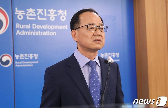 (세종=뉴스1) 김기남 기자 = 박범영 국립축산과학원장이 17일 오전 정부세종청사에서 국내 최초 열풍이용 건초생산 시스템 개발 과정을 설명 하고 있다. 열풍 건초생산으로 안정적인 건초 생산기반 구축, 풀사료 자급률 향상, 축종별 맞춤형 풀사료 생산 효과가 있다고 밝혔다. 2022.8.17/뉴스1