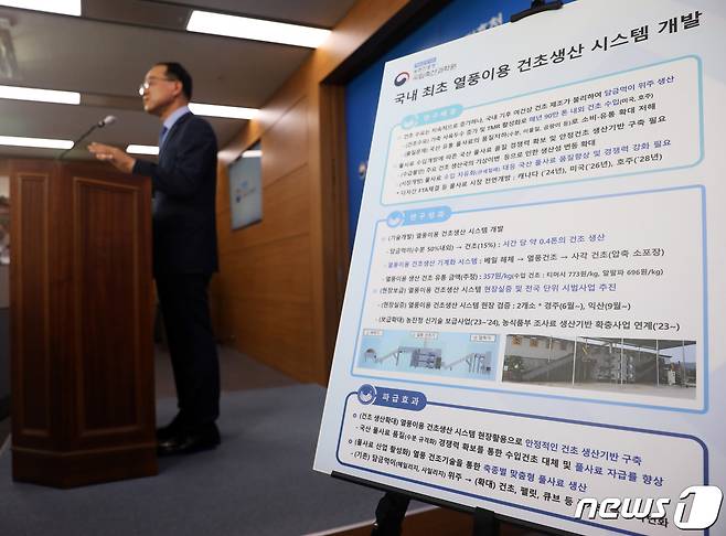 (세종=뉴스1) 김기남 기자 = 박범영 국립축산과학원장이 17일 오전 정부세종청사에서 국내 최초 열풍이용 건초생산 시스템 개발 과정을 설명 하고 있다. 열풍 건초생산으로 안정적인 건초 생산기반 구축, 풀사료 자급률 향상, 축종별 맞춤형 풀사료 생산 효과가 있다고 밝혔다. 2022.8.17/뉴스1
