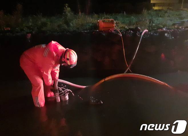 (제주=뉴스1) 오현지 기자 = 17일 오전 제주 서귀포시 성산읍 성산리 도로가 침수돼 소방대원들이 배수 작업을 벌이고 있다.(제주소방안전본부 제공) 2022.8.17/뉴스1