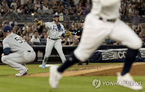 epaselect epa10125039 Tampa Bay Rays third baseman Yandy Diaz (C) is unable to throw out the Yankees' Miguel Andujar (R) over teammate Jeffrey Springs (L) during the fifth inning of the Major League Baseball (MLB) game between the Tampa Bay Rays and the New York Yankees at Yankees Stadium in the Bronx borough of New York, New York, USA, 16 August 2022. EPA/JUSTIN LANE