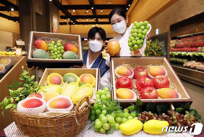 (서울=뉴스1) = 신세계백화점은 2022년 추석을 맞이해 국내산 애플 망고, 청망고, 샤인머스캣 등으로 구성된 이색 과일 선물세트를 판매한다고 17일 밝혔다.