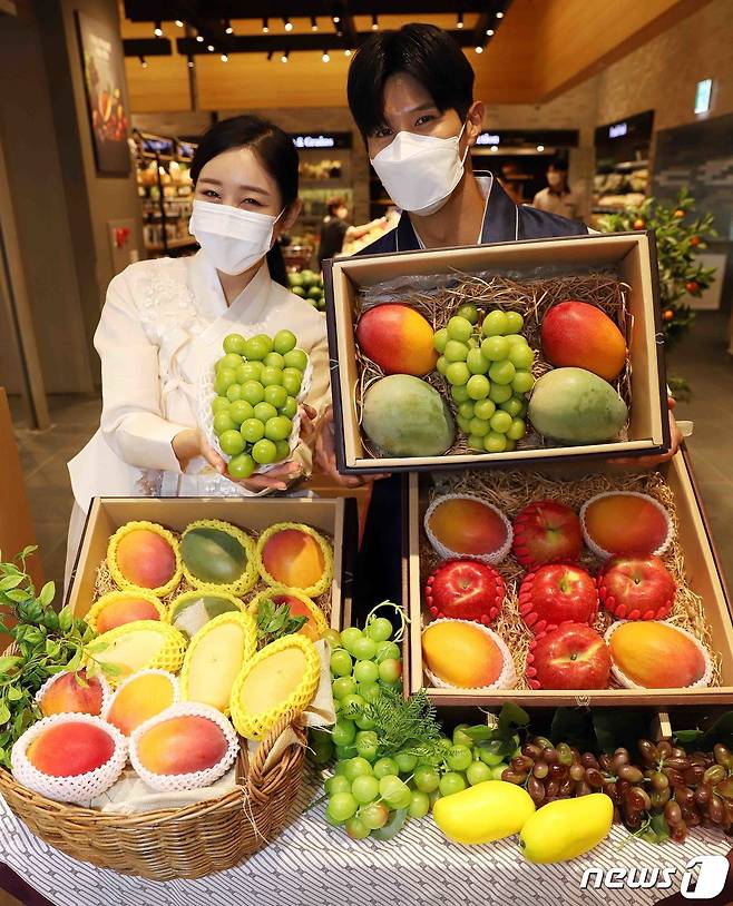 (서울=뉴스1) = 신세계백화점은 2022년 추석을 맞이해 국내산 애플 망고, 청망고, 샤인머스캣 등으로 구성된 이색 과일 선물세트를 판매한다고 17일 밝혔다.
