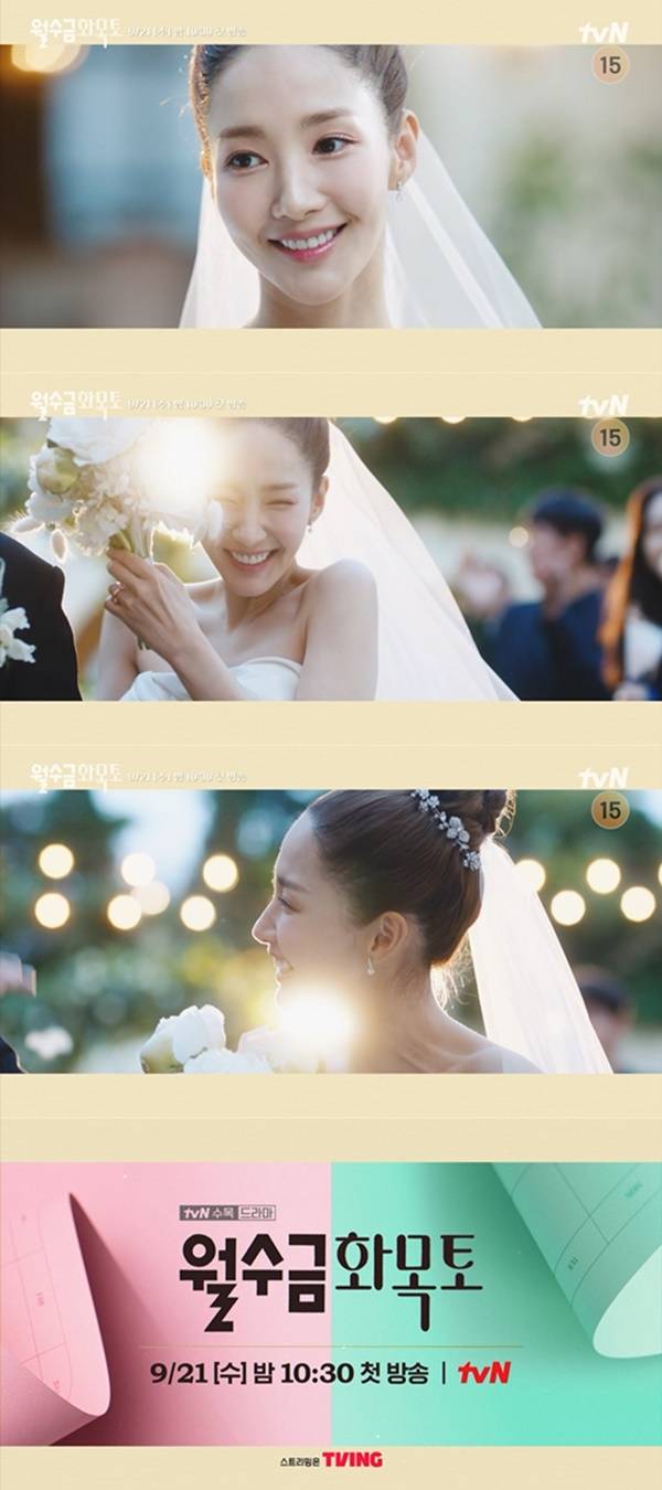 이와 관련 '월수금화목토' 측은 17일, 박민영의 순백의 웨딩드레스 자태가 담긴 티저 영상을 첫 공개해 이목을 집중시킨다.