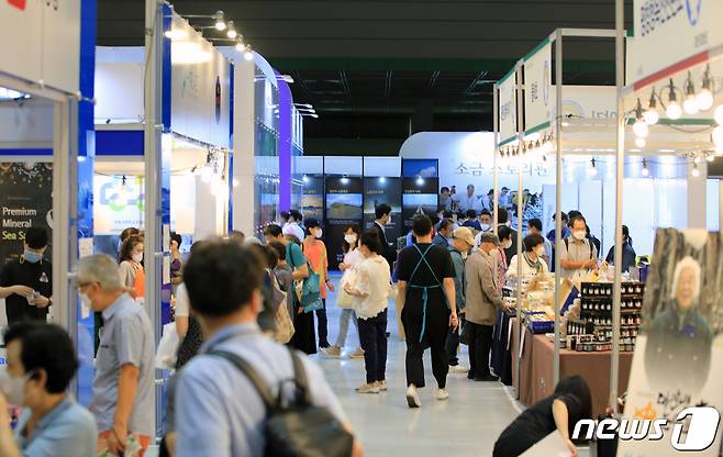 (서울=뉴스1) 구윤성 기자 = 17일 오전 서울 강남구 코엑스에서 열린 '2022 한가위 명절선물전·소금박람회'에서 참관객들이 명절선물을 살펴보고 있다. 2022.8.17/뉴스1