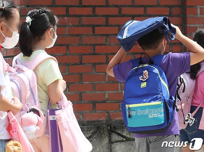 (서울=뉴스1) 송원영 기자 = 초등학교 개학이 시작된 17일 오후 서울 시내의 한 초등학교에서 개학을 맞은 한 학생이 뜨거운 햇살에 신발주머니로 머리를 가리며 하교하고 있다. 2022.8.17/뉴스1