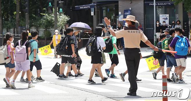 (서울=뉴스1) 송원영 기자 = 초등학교 개학이 시작된 17일 오후 서울 시내의 한 초등학교에서 개학을 맞은 학생들이 수업을 마치고 하교하고 있다. 2022.8.17/뉴스1