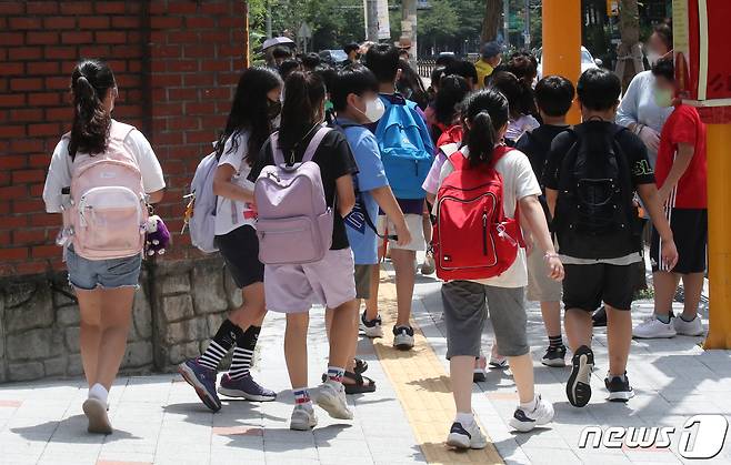 (서울=뉴스1) 송원영 기자 = 초등학교 개학이 시작된 17일 오후 서울 시내의 한 초등학교에서 개학을 맞은 학생들이 수업을 마친 후 하교하고 있다. 2022.8.17/뉴스1