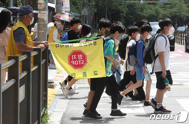 (서울=뉴스1) 송원영 기자 = 초등학교 개학이 시작된 17일 오후 서울 시내의 한 초등학교에서 개학을 맞은 학생들이 수업을 마친 후 하교하고 있다. 2022.8.17/뉴스1