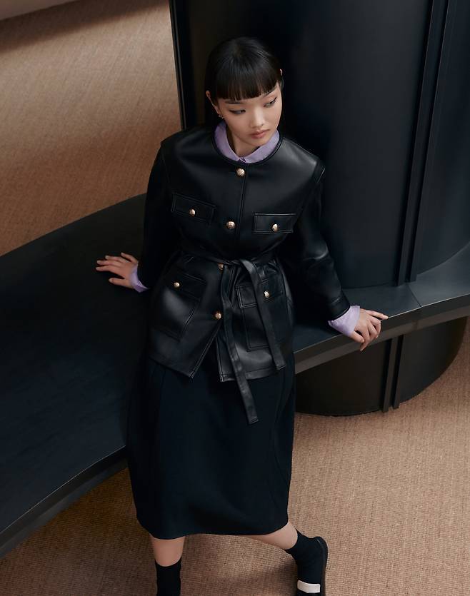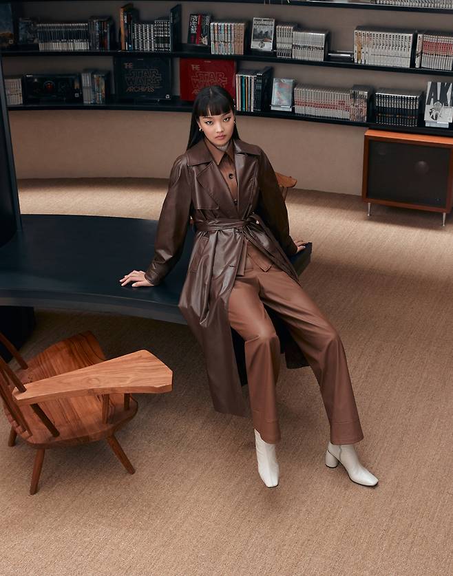 특히 화보 속 모델이 착용한 레더 아이템들이 눈길을 끈다. 은은한 광택감의 페이크 레더 소재 롱 트렌치코트는 여유 있는 실루엣에 벨트로 다양한 연출이 가능하다.