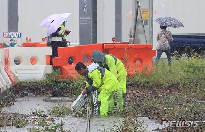 [제주=뉴시스] 우장호 기자 = 제주지역에 정체(장마)전선 영향으로 호우특보가 발효된 17일 오후 제주시 용담2동 제주공항 인근 도로변에서 공사 관계자들이 배수구를 정비하고 있다. 기상청은 이번 비가 오는 18일 새벽시간까지 이어질 것으로 예측했다. 2022.08.17. woo1223@newsis.com