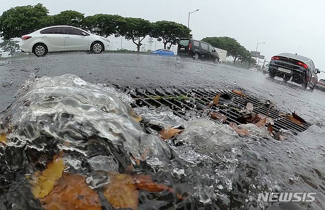 [제주=뉴시스] 우장호 기자 = 제주지역에 정체(장마)전선 영향으로 호우특보가 발효된 17일 오후 제주시 용담2동 제주공항 주변 도로변에 빗물이 흐르고 있다. 기상청은 이번 비가 오는 18일 새벽시간까지 이어질 것으로 예측했다. 2022.08.17. woo1223@newsis.com