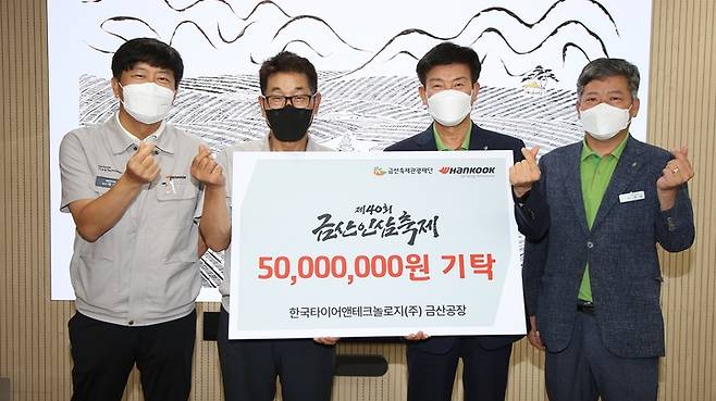 [대전=뉴시스] 김양수 기자 = 17일 한국타이어 황성학(왼쪽서 두번째) 금산공장장이 충남 금산군청을 찾아 박범인(오른쪽서 두번째) 금산군수에게 '2022 금산인삼축제'의 성공개최를 위해 후원금 5000만원을 전달하고 있다.(사진=한국타이어 제공).2022.08.17.photo@newsis.com