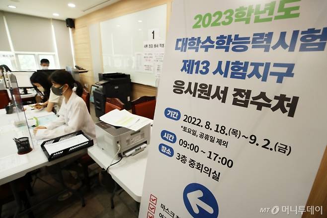 2023학년도 대학수학능력시험 원서 접수를 하루 앞둔 17일 서울 영등포구 남부교육지원청에서 관계자들이 점검을 하고 있다.