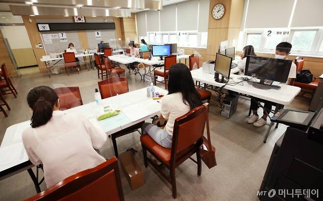 2023학년도 대학수학능력시험 원서 접수를 하루 앞둔 17일 서울 영등포구 남부교육지원청에서 관계자들이 점검을 하고 있다.