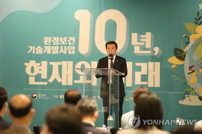 (서울=연합뉴스) 유제철 환경부 차관이 17일 오후 서울 종로구 포시즌스호텔서울에서 '환경보건기술개발사업 10년, 현재와 미래'라는 주제로 열린 학술행사에서 축사하고 있다. 2022.8.17 [환경부 제공. 재판매 및 DB 금지]