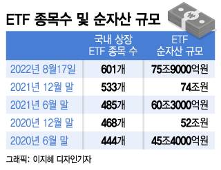 이같은 추세라면 올해 ETF 신규 상장 종목은 100개를 넘어설 것으로 전망된다. 현재 ETF 전체 순자산은 7월말 기준 75조9000억원을 기록했다. 2020년 6월 말 ETF 순자산 규모는 45조4000억원으로 약 2년 만에 ETF 순자산 규모가 67%가량 증가했다.
