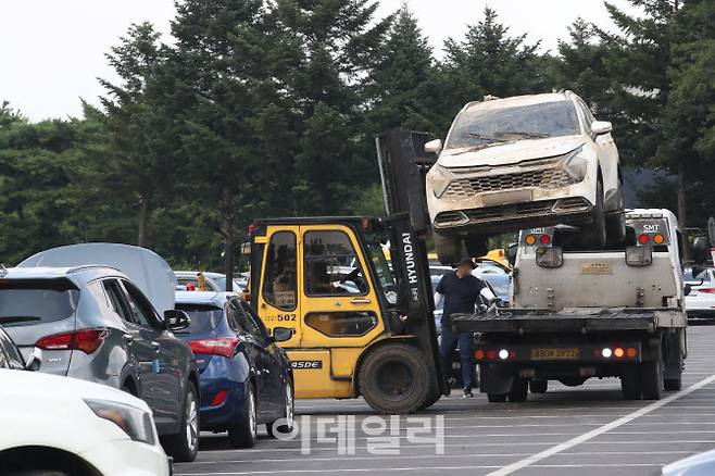 [이데일리 이영훈 기자] 8일부터 이틀간 내린 기록적인 폭우에 침수 피해를 입은 차량들이 17일 오후 경기도 과천 서울대공원 주차장에 마련된 삼성화재, KB손해보험 임시 보상서비스센터에 주차돼 있다.