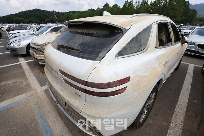 [이데일리 이영훈 기자] 8일부터 이틀간 내린 기록적인 폭우에 침수 피해를 입은 차량들이 17일 오후 경기도 과천 서울대공원 주차장에 마련된 삼성화재, KB손해보험 임시 보상서비스센터에 주차돼 있다.